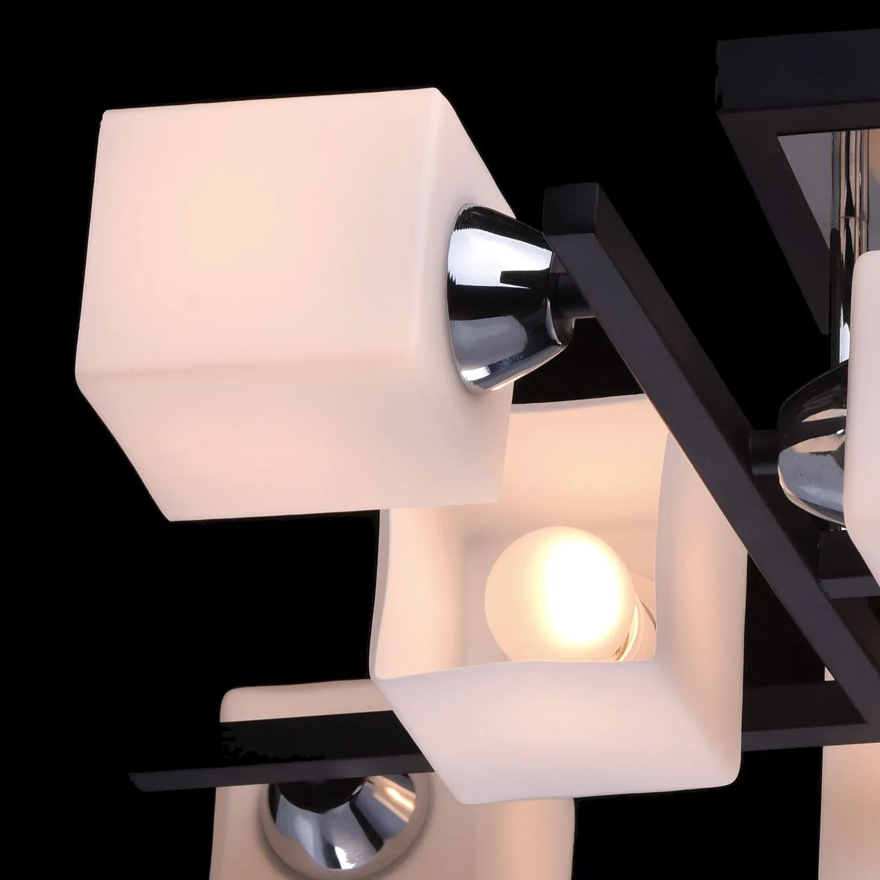Металлическое основание цвета темного кофе, декоративные вставки из металла цвета хрома, плафоны из